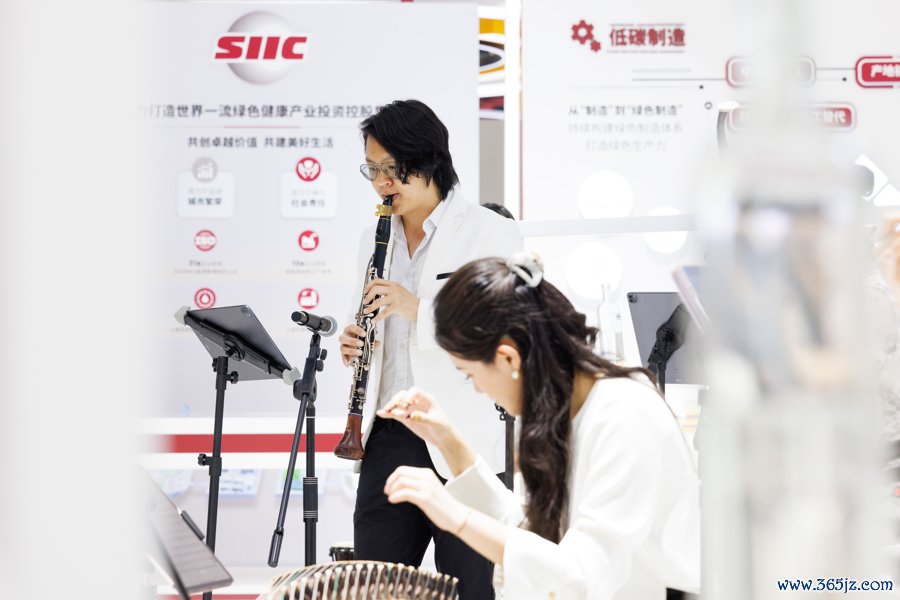 青年音乐家黄野将新作《音愈》带到了展台现场,伴随中西乐器管弦齐奏,观众沉浸感受来自“乐”的治愈。黄野表示,作品灵感来源于“药食同源,药乐同根”——“藥”作为“药”的繁体,字形构成中包含有“乐”,因此他认为音乐也可以作为一种“药”,用来治愈人们的心灵。此外,他还用绿色工厂净化后的废水水样制作了一些水瓶乐器,在清脆的打击声中传达绿色低碳理念。