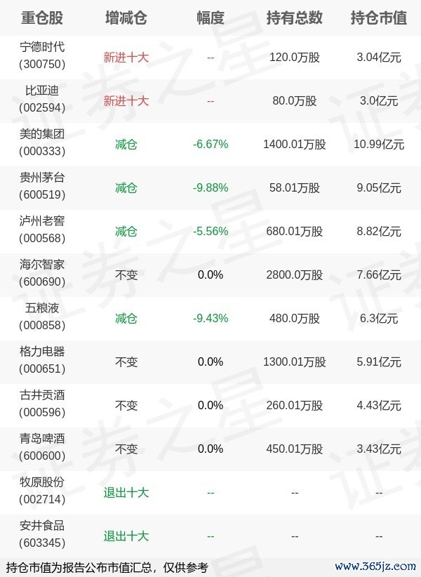 本站消息,4月22日汇添富基金旗下胡昕炜管理的汇添富消费行业混合型基金公布一季报云操盘,近1年净值增长率-9.36%。与上一季度相比,该基金前十大重仓股新增宁德时代,比亚迪;其中美的集团持仓占比9.97%,为该基金第一大重仓股;牧原股份,安井食品等退出前十大重仓股;详细数据如下: